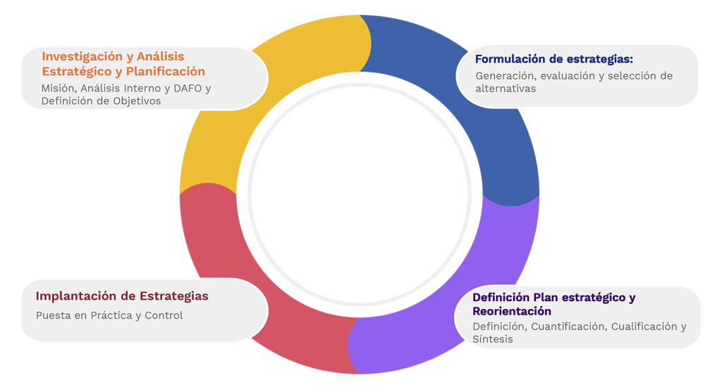 - Investigación y Análisis Estratégico y Planificación: Misión, Visión, Valores, Análisis Interno, Externo, DAFO y Definición de Objetivos.